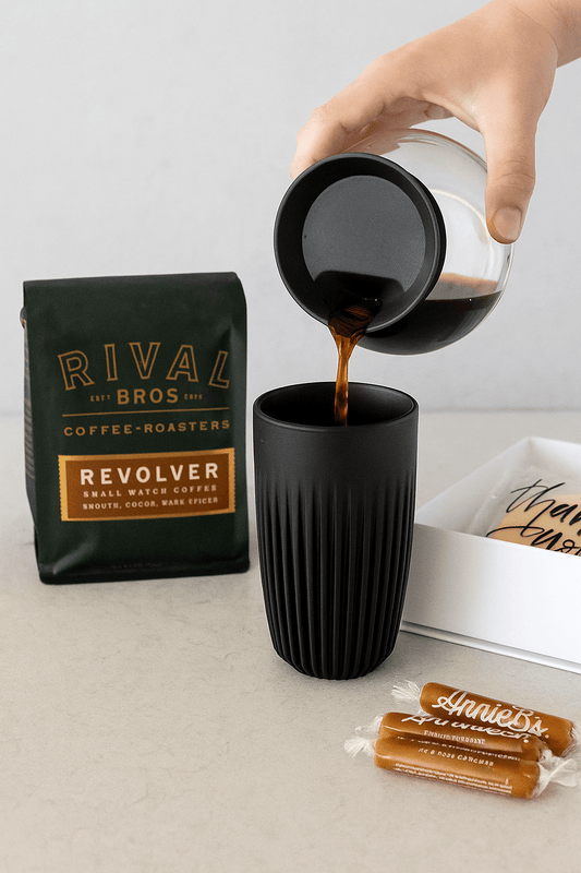 Coffee Gift Box with Travel Mug, Whole Bean Coffee & Caramels – Premium Thank You Gift for Him or Her